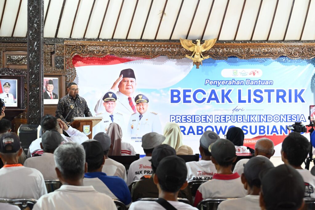 PURBALINGGA – Sebanyak 100 penarik becak di Kabupaten Purbalingga tersenyum bahagia setelah resmi menerima becak listrik bantuan Presiden RI Prabowo Subianto. Bantuan yang disalurkan melalui Yayasan Gerakan Solidaritas Nasional (GSN) ini diserahkan secara simbolis oleh Wakil Ketua Yayasan GSN Nanik S. Deyang dan disaksikan langsung oleh Wakil Bupati Purbalingga Dimas Prasetyahani di Pendapa Dipokusumo, Kamis (04/12/2025).