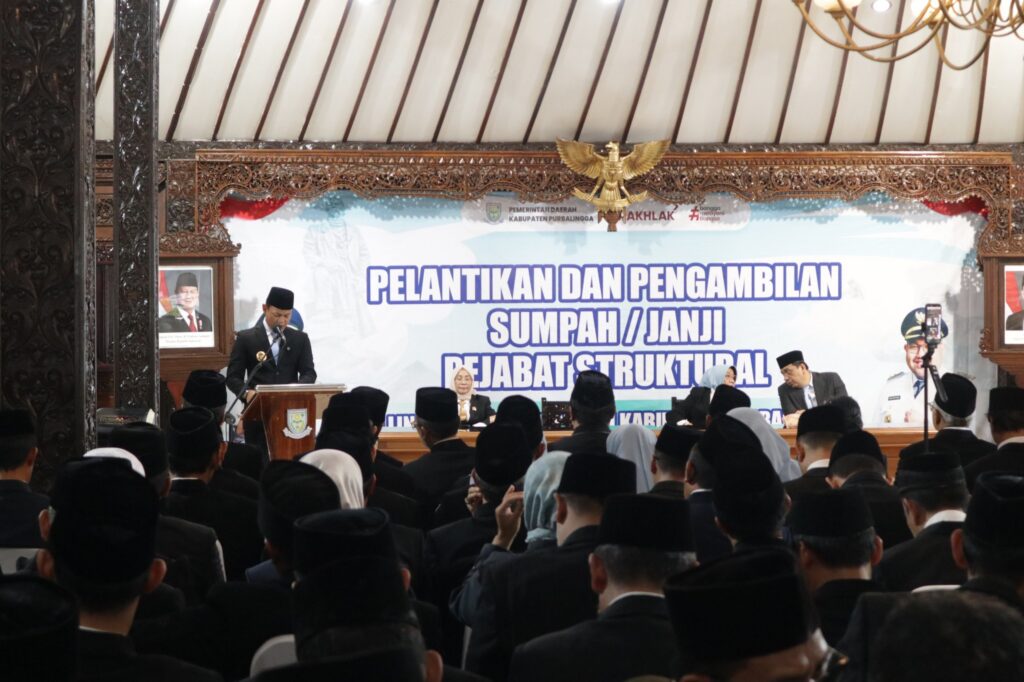 PURBALINGGA – Bupati Purbalingga Fahmi M Hanif secara resmi melantik sebanyak 113 pejabat administrator (eselon III) di lingkungan Pemkab Purbalingga. Pelantikan dalam rangka mengisi kekosongan jabatan yang terjadi akibat penggabungan sejumlah Organisasi Perangkat Daerah (OPD) ini dilakukan di Pendapa Dipokusumo, Selasa (31/3/2026).