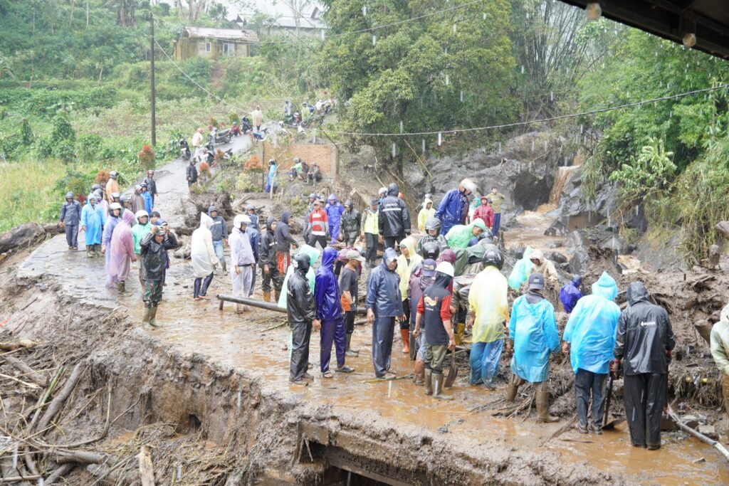 “Banjir bandang membawa banyak material, mulai dari batu, kayu, pohon, lumpur yang berasal dari area hutan (pegunungan, red),” kata Bupati.