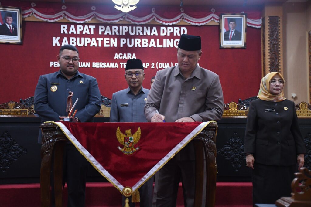 PURBALINGGA – DPRD dan Pemerintah Kabupaten (Pemkab) Purbalingga menyepakati bersama dua Rancangan Peraturan Daerah (Raperda) menjadi Peraturan Daerah (Perda) pada Rapat Paripurna DPRD Kabupaten Purbalingga yang digelar di Ruang Rapat DPRD, Jumat (10/10/2025). Dua Raperda tersebut yakni : Raperda tentang Perusahaan Perseroan Daerah Bank Perekonomian Rakyat (BPR) Artha Perwira dan Raperda tentang Penyertaan Modal Daerah kepada Badan Usaha Milik Daerah (BUMD).